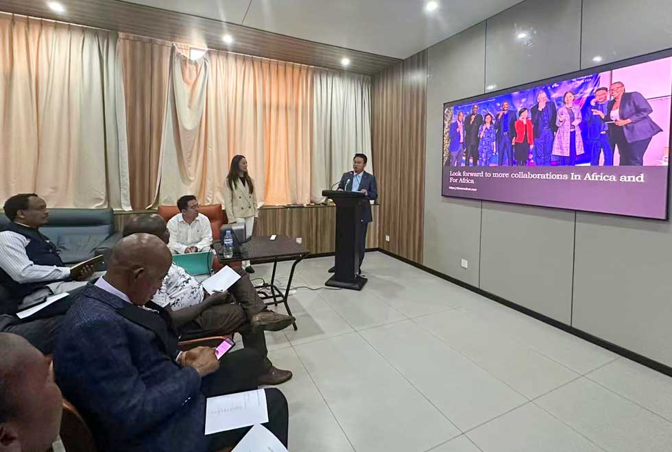 No início da reunião, o responsável pela Tiankang Company apresentou à equipe de estudo um panorama detalhado da história da empresa, suas principais atividades e seu posicionamento estratégico no mercado africano. Como importante base de produção da Tiankang Medical na África, a empresa atua fortemente no setor de insumos médicos locais. Desde sua inauguração, há um ano, a Tiankang tem garantido o fornecimento estável de produtos essenciais, como seringas descartáveis para vacinas, oferecendo um forte suporte ao desenvolvimento de iniciativas de saúde pública na África. Durante a apresentação, o responsável enfatizou a experiência prática da empresa em operações localizadas, inovação tecnológica e controle de qualidade, demonstrando a responsabilidade e o compromisso das empresas chinesas no processo de internacionalização.